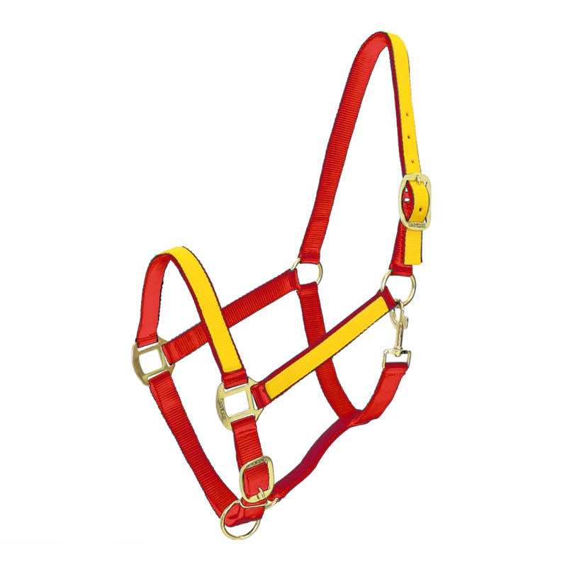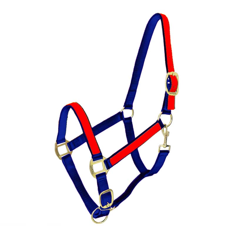 Horse halter made of durable heavy-duty nylon, suitable for everyday use. Made from synthetic material with two-tone inserts, designed to match your favorite lead rope. Adjustable metal buckles.