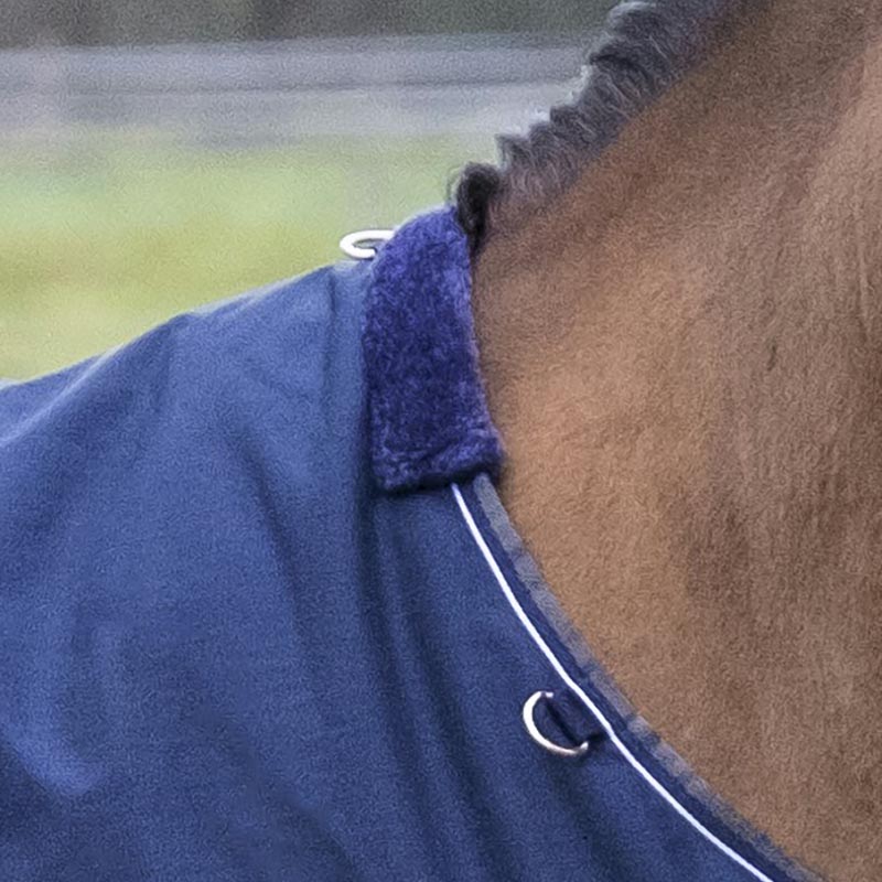 Waterproof turnout rug for horses and ponies padded 150 grams. Breathable and waterproof paddock horse rug, with Ripstop treatment in 600 Denier polyester, lined with anti-scratch and anti-static synthetic fabric. Wide rainproof tail cover, padded edge antichafing on wither with synthetic fur. Double chest closure, adjustable straps for closure on the belly.