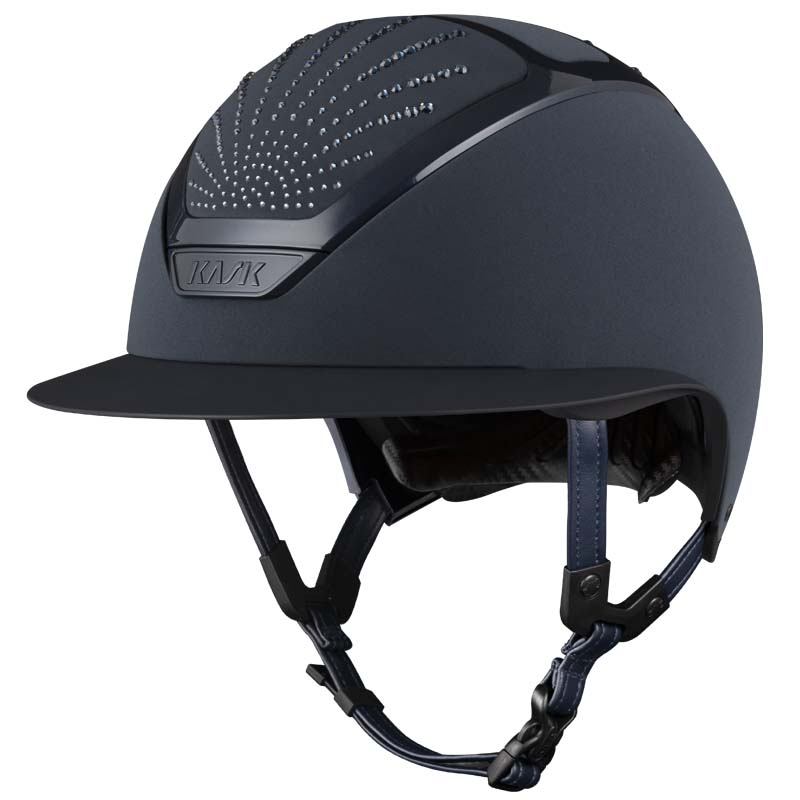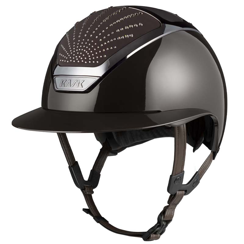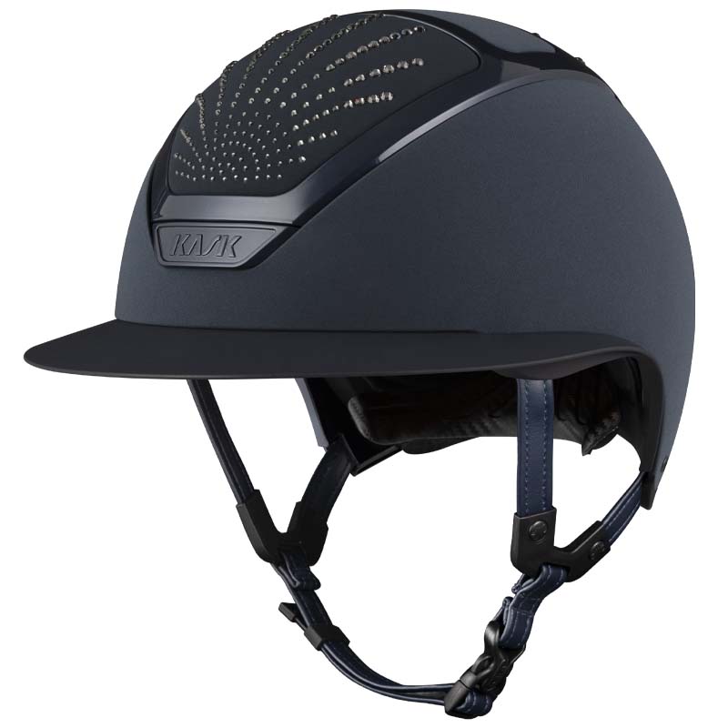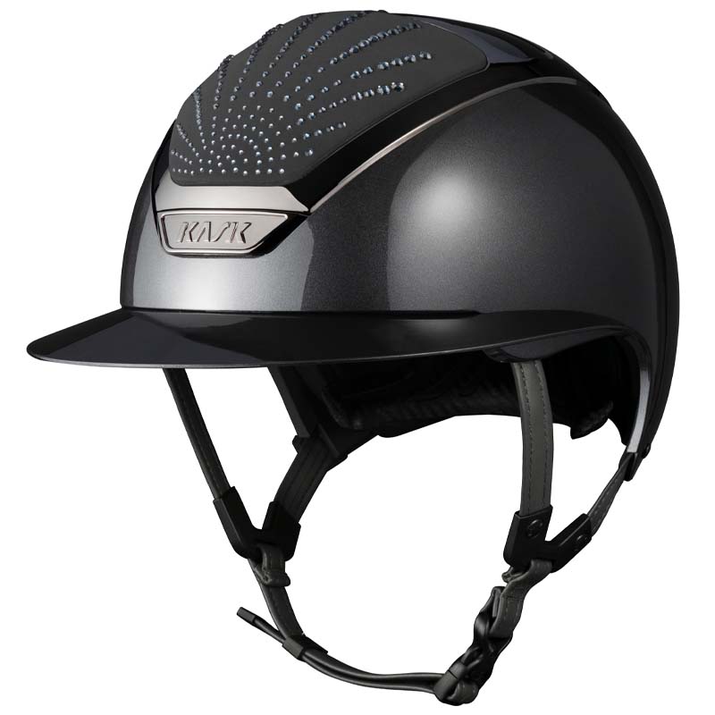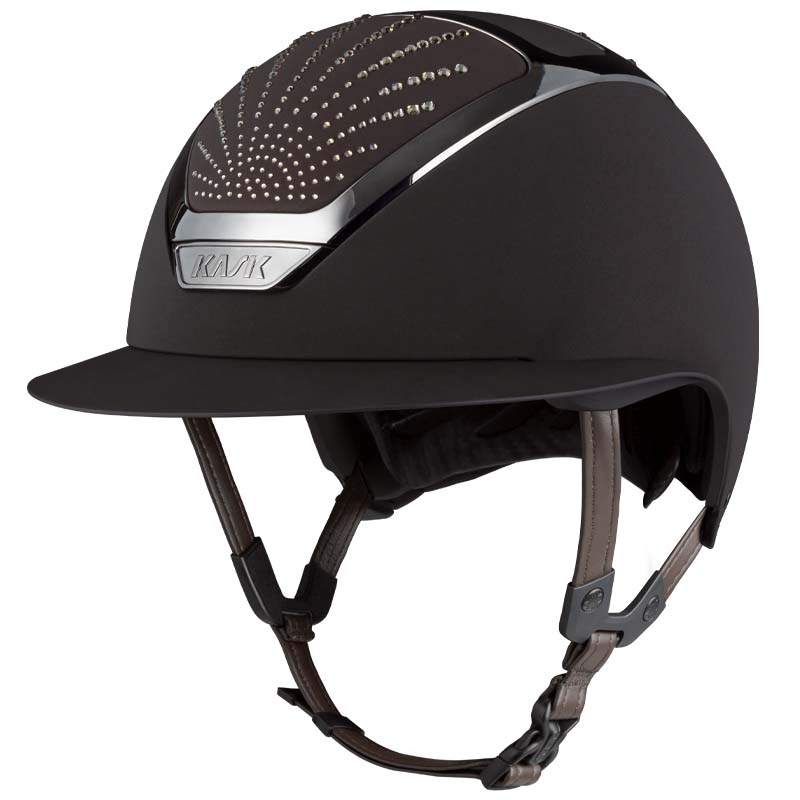 KASK riding helmet with wide visor Star Lady ANIMA collection featuring Swarovski crystals in the ORIGIN design. Available in glossy or matte finish. The KASK Star Lady ANIMA helmet is a premium wide visor model, appreciated by riders who seek elegance and safety. The front and rear parts of the shell are covered in fabric and decorated with crystals in the Origin configuration, adding a touch of brilliance to stand out during the most important competitions. The helmet can be fully customized, choosing between glossy or matte finish and 3 different Swarovski colors: Blue Montana, Graphite grey and Greige brown.