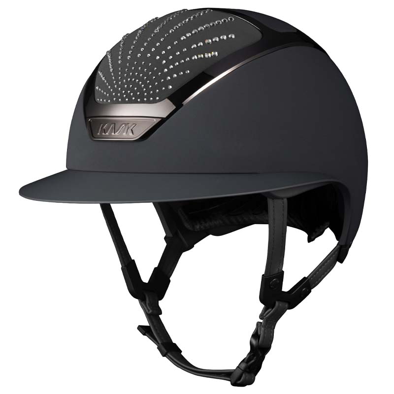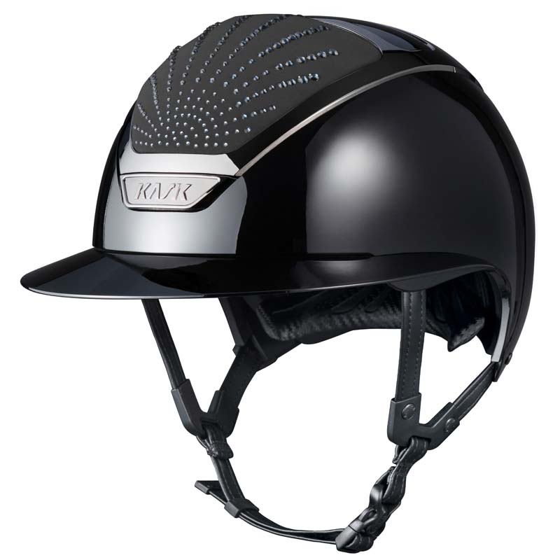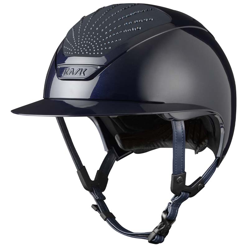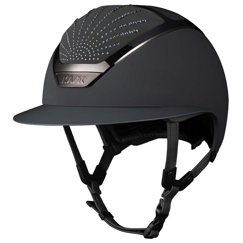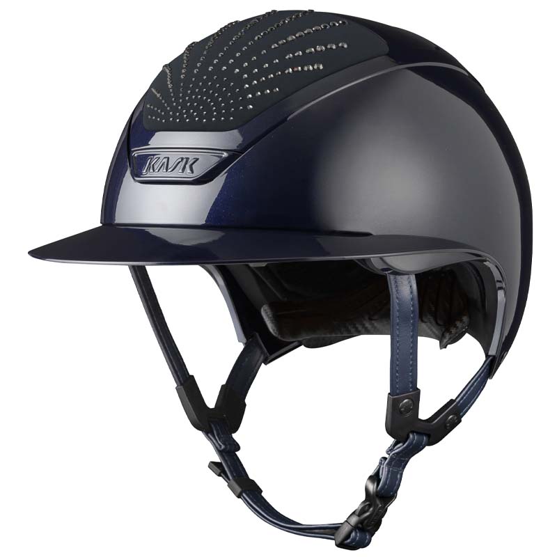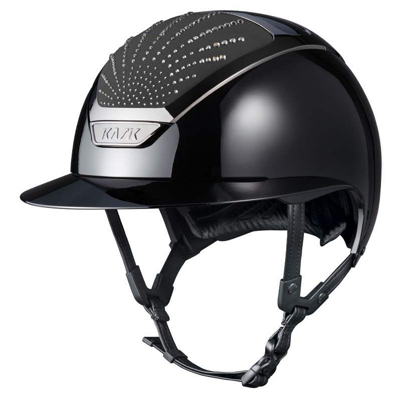 KASK riding helmet with wide visor Star Lady ANIMA collection featuring Swarovski crystals in the ORIGIN design. Available in glossy or matte finish. The KASK Star Lady ANIMA helmet is a premium wide visor model, appreciated by riders who seek elegance and safety. The front and rear parts of the shell are covered in fabric and decorated with crystals in the Origin configuration, adding a touch of brilliance to stand out during the most important competitions. The helmet can be fully customized, choosing between glossy or matte finish and 3 different Swarovski colors: Blue Montana, Graphite grey and Greige brown.